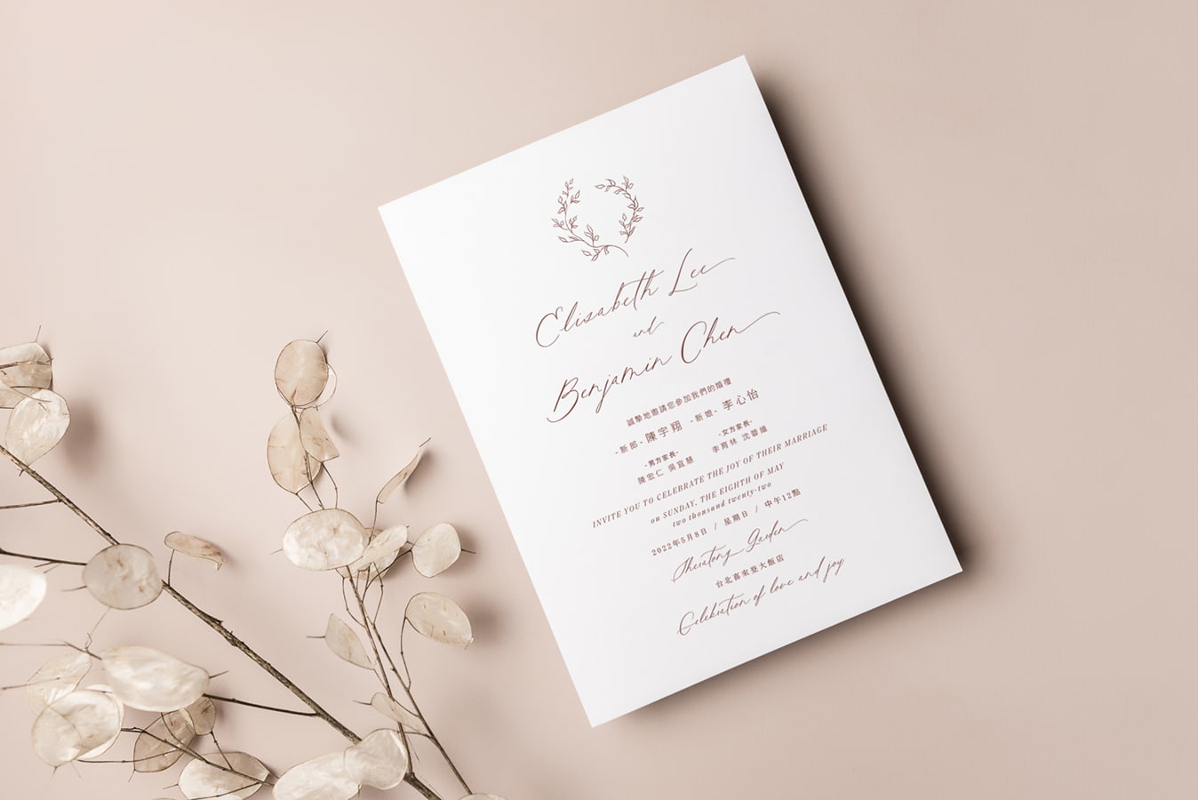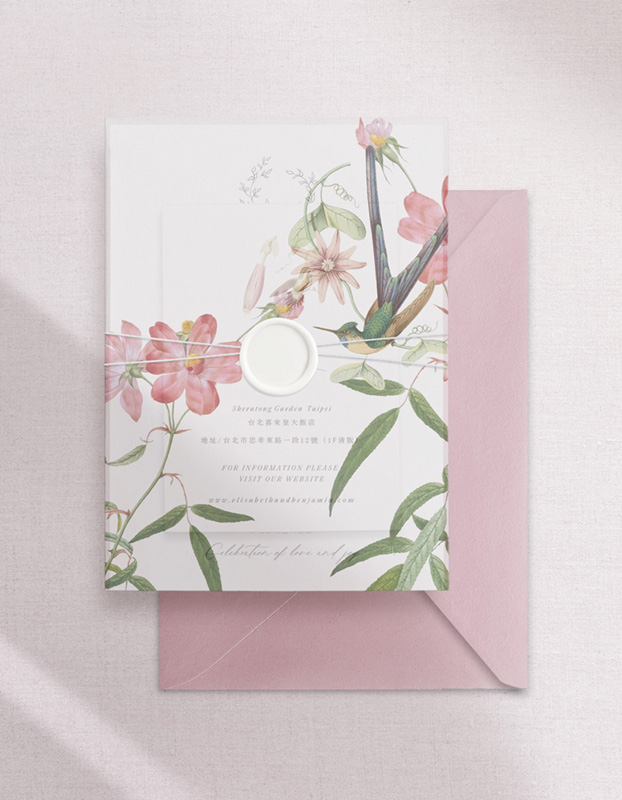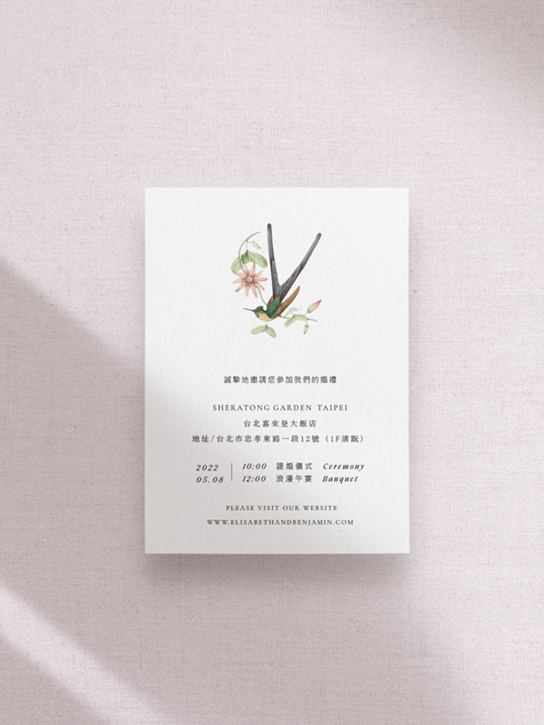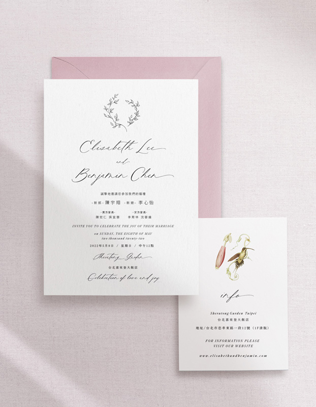 Spring Nymphs是一個富有極簡表現力與藝術感的系列,為了喜愛帶有現代浪漫風格的夫婦所設計,花卉與蜂鳥插圖帶出清新氛圍與簡約的文字排版是最完美的結合。您可以自由訂製英文手寫風格字體與花圈設計,將創造出更加貼近您美感的邀請函。